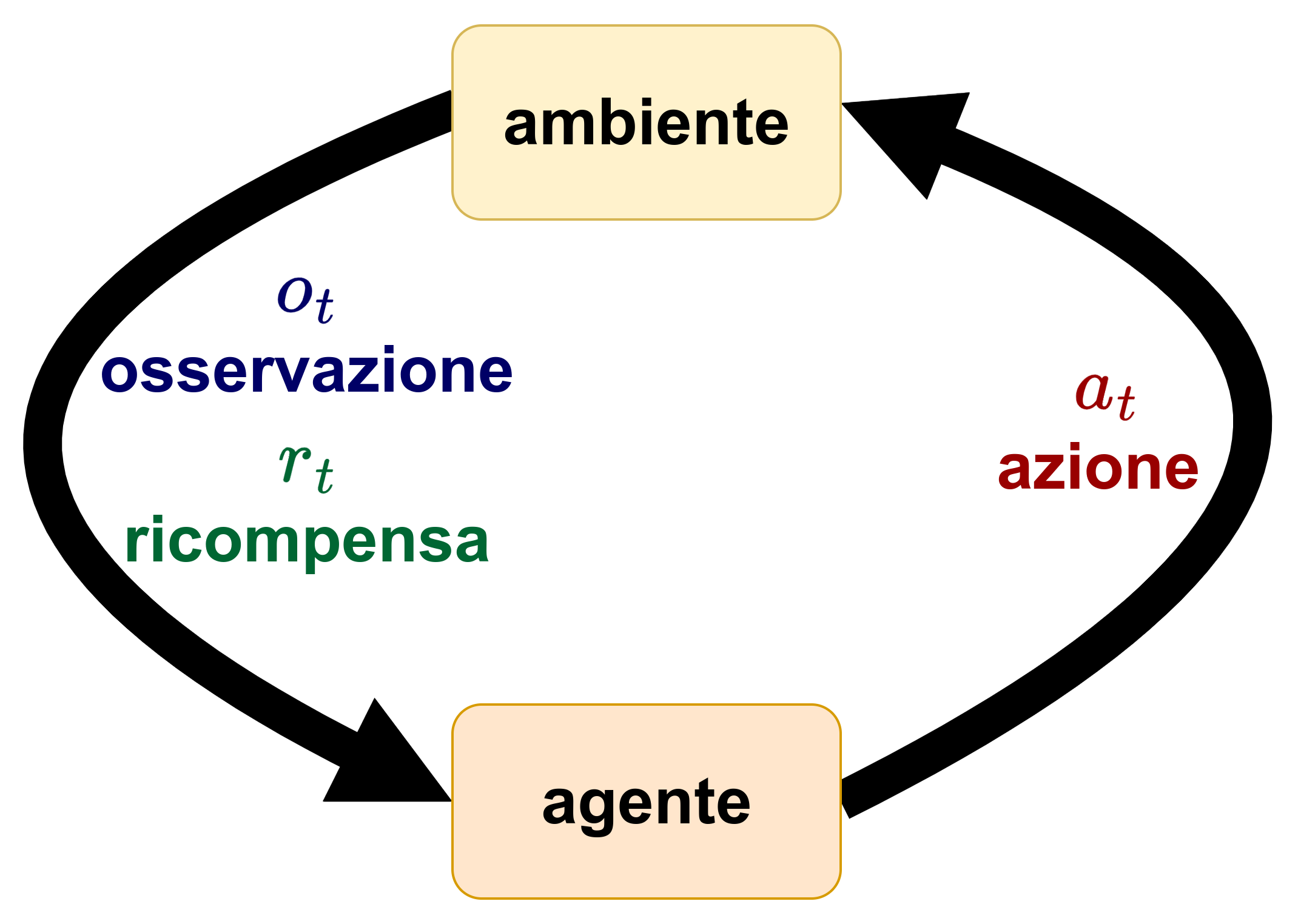 In particolare ogni azione \(a_t\) influisce sull'ambiente la cui variazione rileviamo attraverso l'osservazione \(o_t\) e l'eventuale ricompensa \(r_t\) .