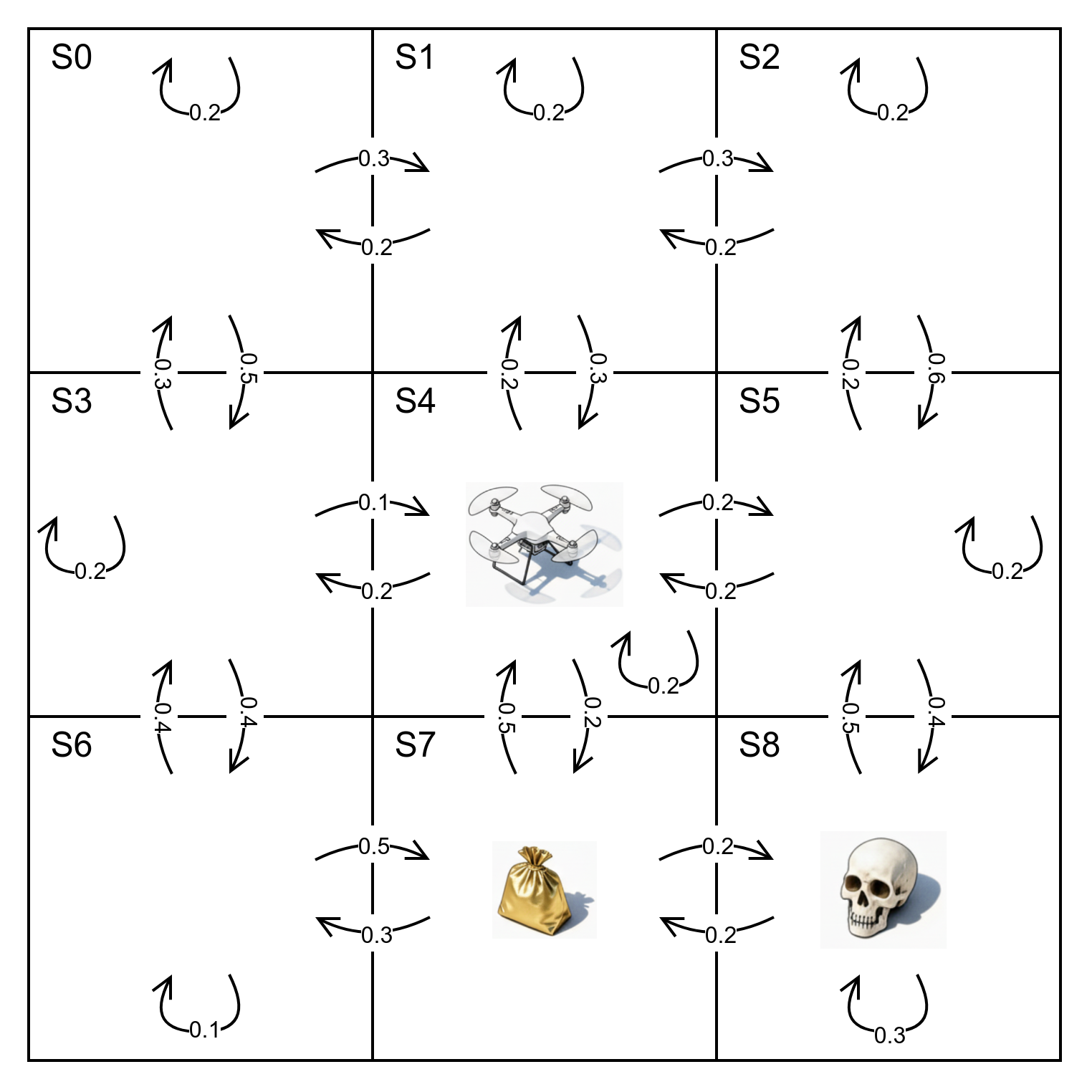 Vediamo nell'immagine un esempio di modellazione di una catena di Markov dove si descrive un ambiente, costituito da 9 stati numerati da s0 a s8, nel quale si troverà ad agire un drone, con le relative distribuzioni di probabilità di transizione tra gli stati.