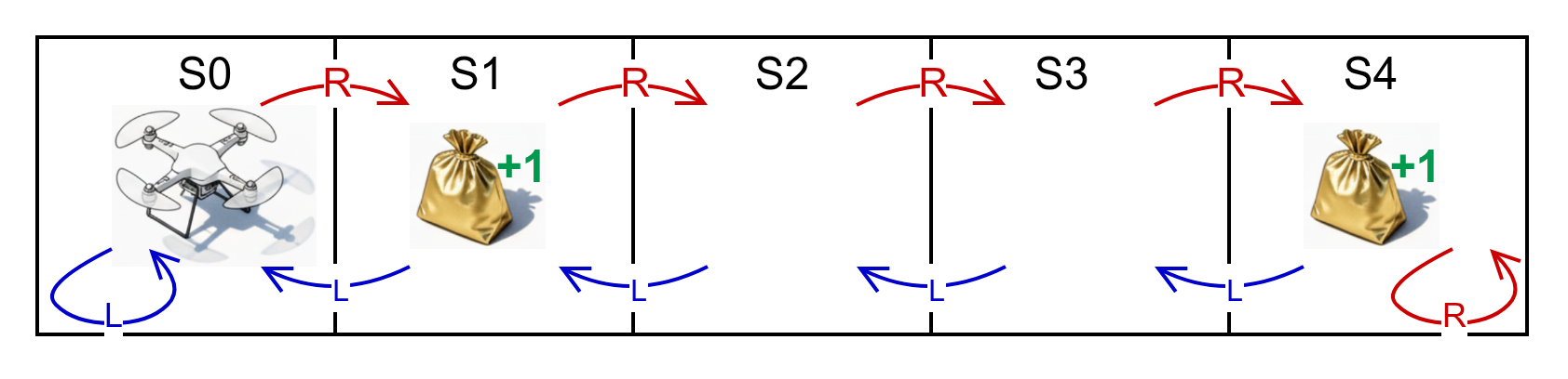 Sviluppiamo di seguito un semplice esempio nelle due ipotesi di orizzonte infinito e orizzonte finito, nel quale un drone deve muoversi in un ambiente nel quale identifichiamo 5 stati S0-S4 cercando di massimizzare il ritorno raggiungendo gli stati con il target di oro dove riceve una ricompensa +1 indipendemente dall'azione scelta. Sono possibili due azioni "R" per provare a spostare il drone nello stato a destra e "L" nello stato a sinistra. Ipotizziamo per semplicità che le azioni producano in modo deterministico (p=1) la transizione allo stato desiderato. Applichiamo quindi l'algoritmo di value iteration per determinare le policy ottime nell'ipotesi di Orizzonte Infinito, nel quale il drone ha una batteria virtualmente inesauribile, e un Orizzonte Finito di 5 step, entrambi con \(\gamma=0.9\)